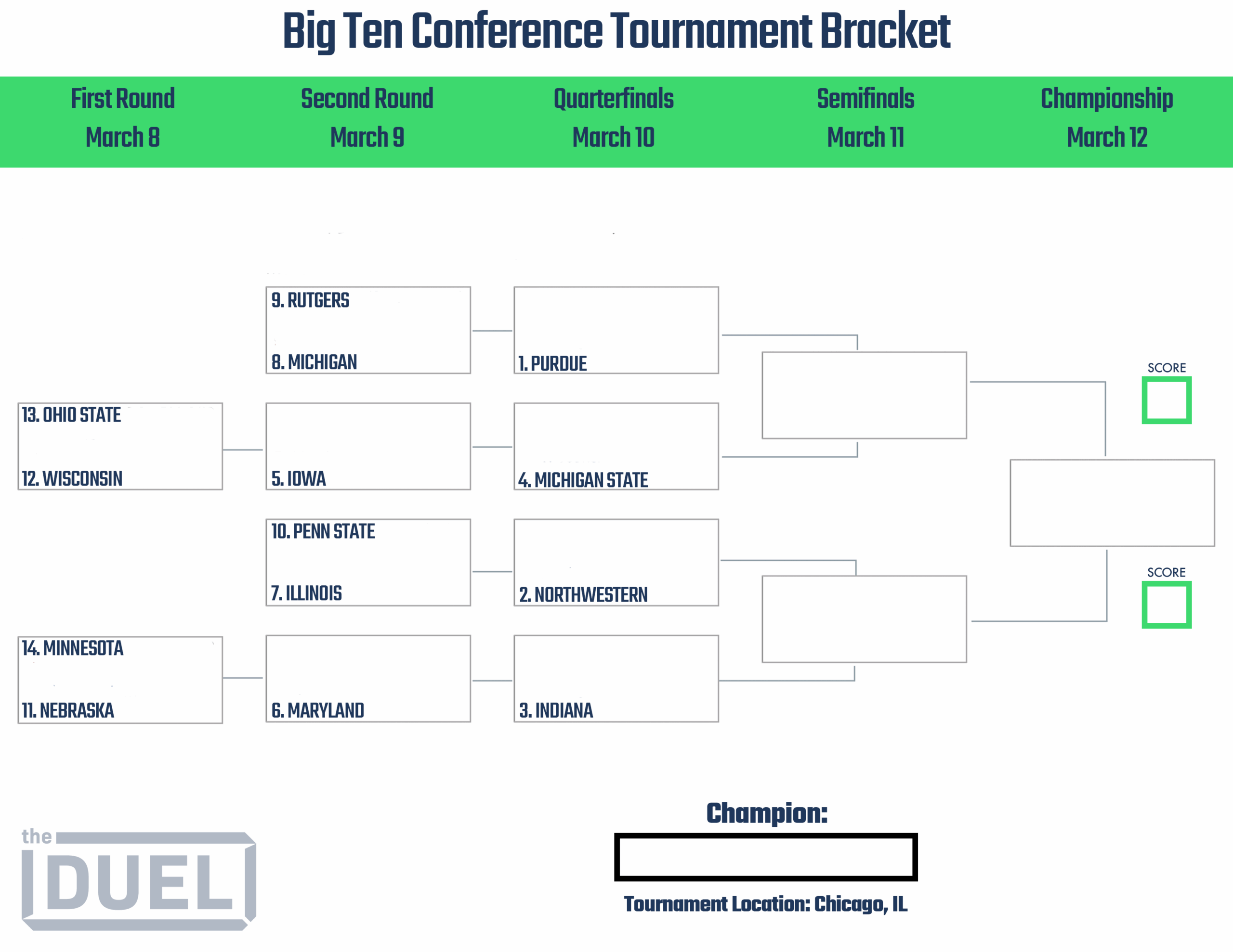 Our printable bracket includes all the matchups, dates, and times for each game in the Big Ten Tournament. Simply download and print it out to have a handy reference as the tournament progresses.