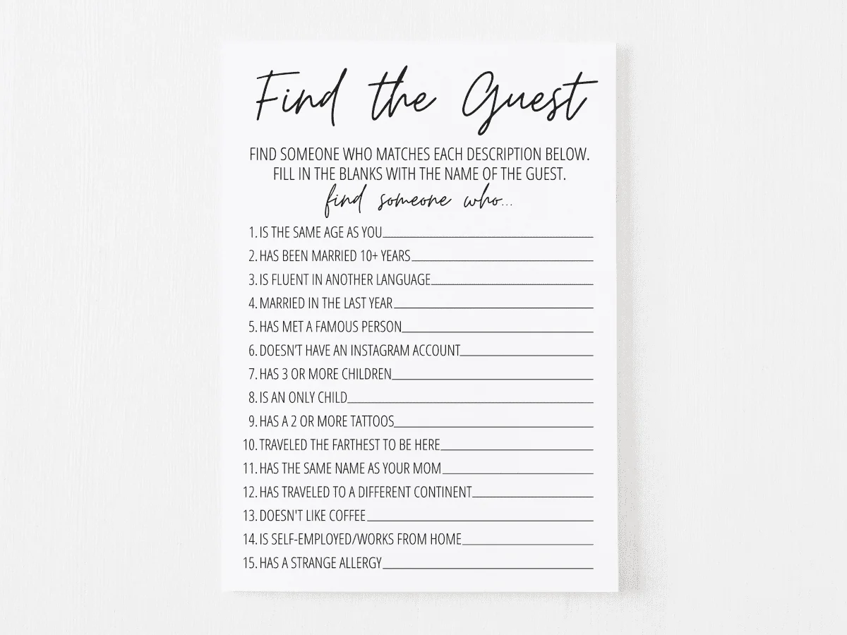 From finding someone who has been married for over 10 years to locating a guest who shares the same birthday month as the bride, this game is a great way to get everyone talking and laughing together. Plus, it’s a fantastic icebreaker for guests who may not know each other well.