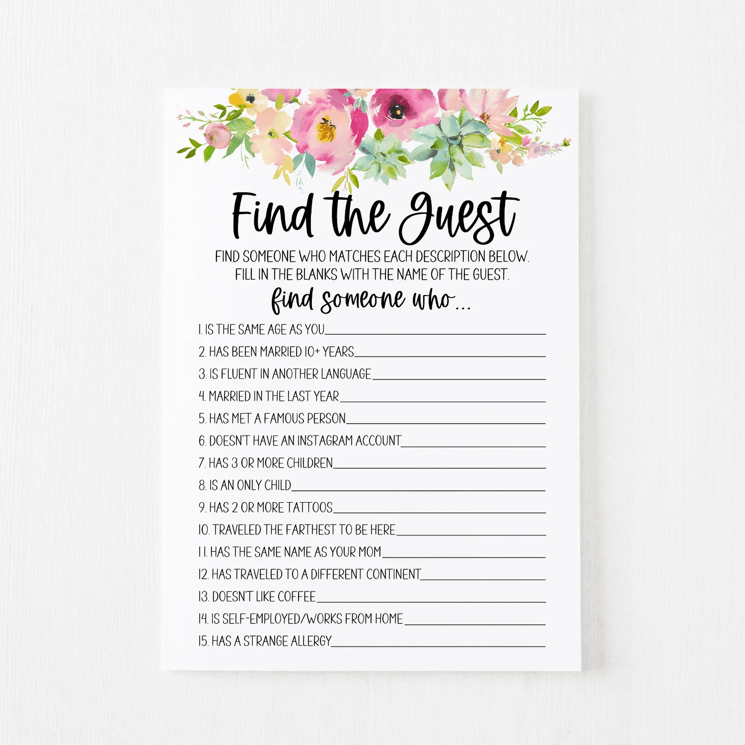 The “Find the Guest” game is a classic bridal shower activity that never fails to entertain. Simply distribute the printable game cards to your guests and have them mingle to find someone who fits each description on the card.