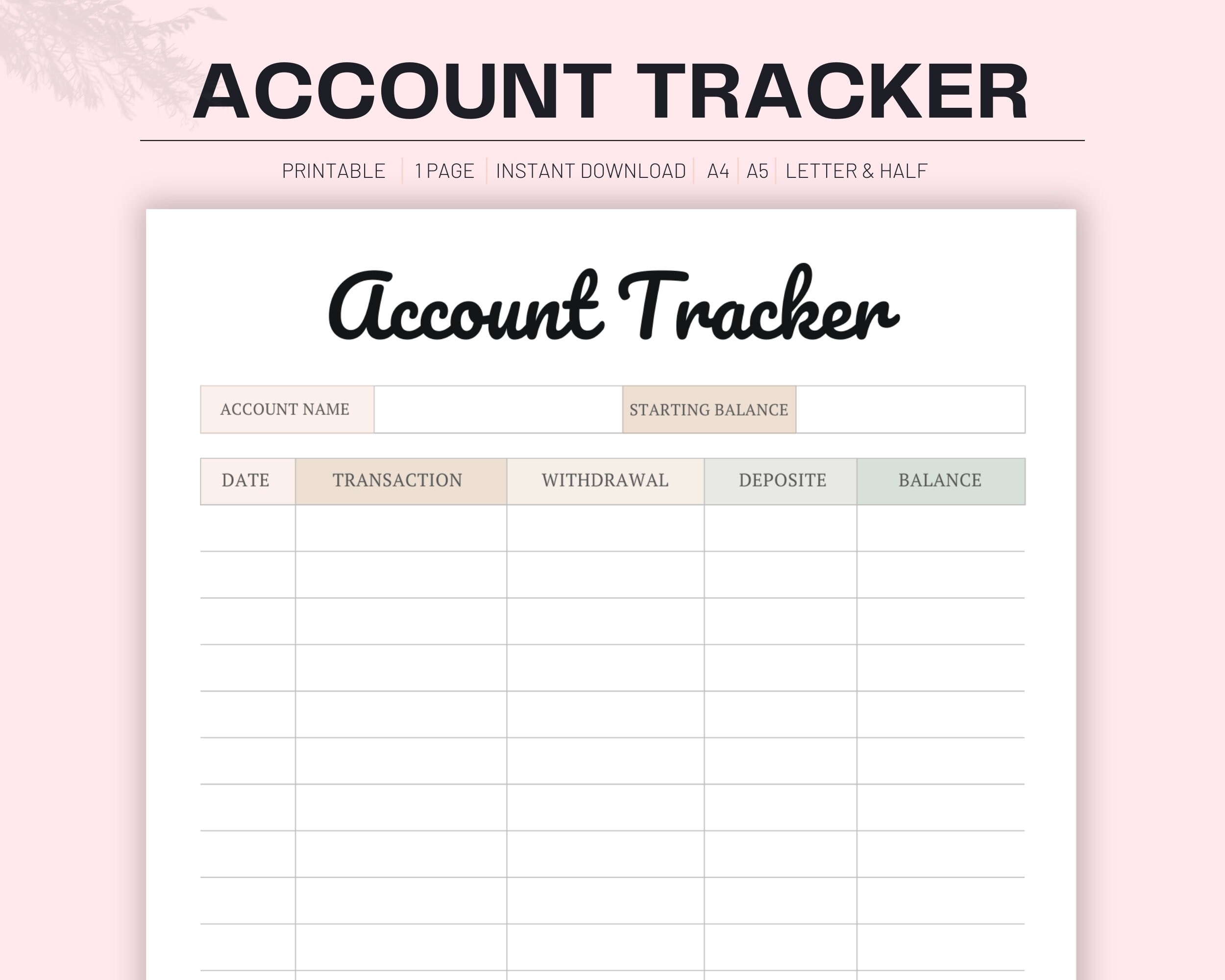 Printable Account Tracker Bank Balance Log digital PDF A4 A5 Letter Etsy