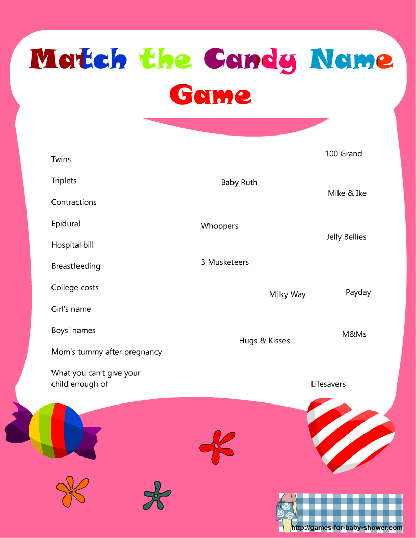 To play the game, simply print out the game cards and distribute them to your guests along with a pen or pencil. Have them match the baby-related phrases with the corresponding candy bar names. The person with the most correct answers wins a sweet prize!