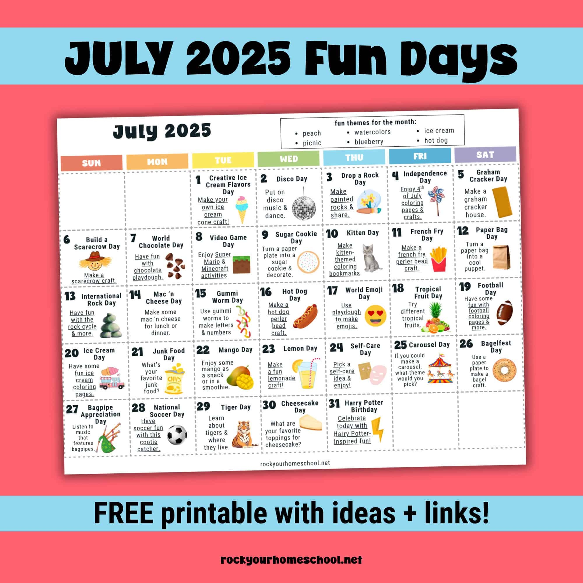 July 2025 Fun Days Calendar color Rock Your Homeschool