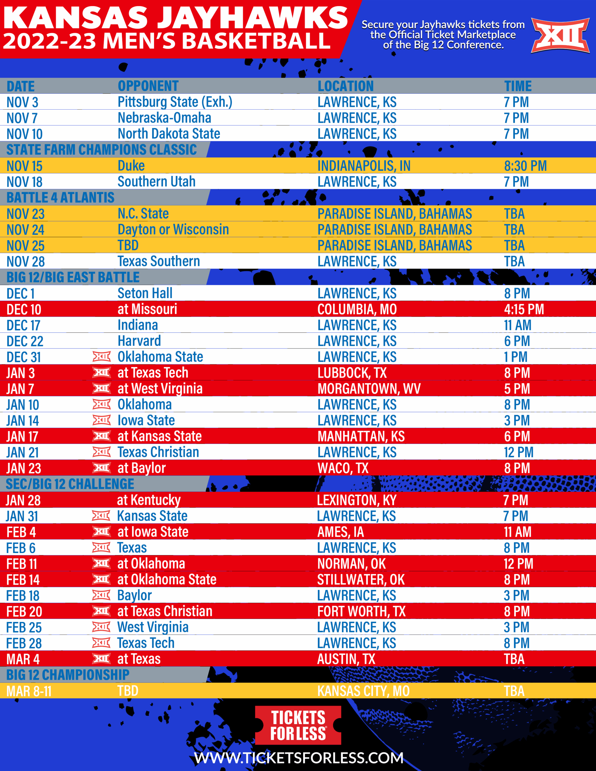 Printable Schedule KU Basketball Schedule
