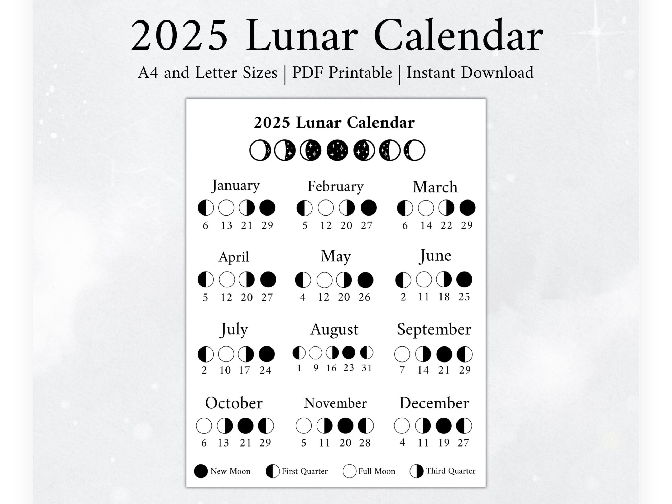 2025 Moon Phase Calendar Printable Lunar Chart digital Download Etsy