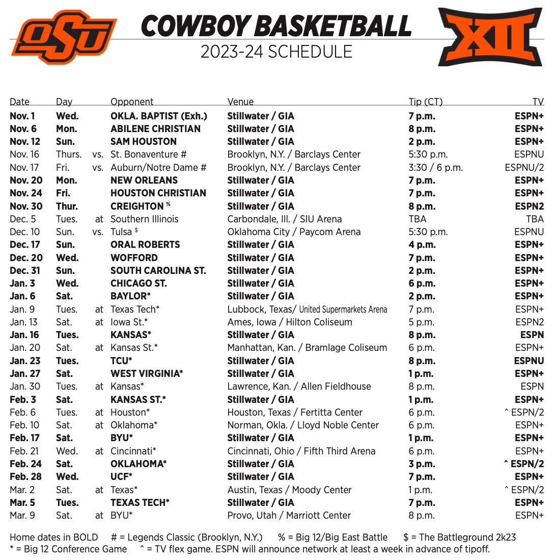 Oklahoma State Basketball Schedule Printable