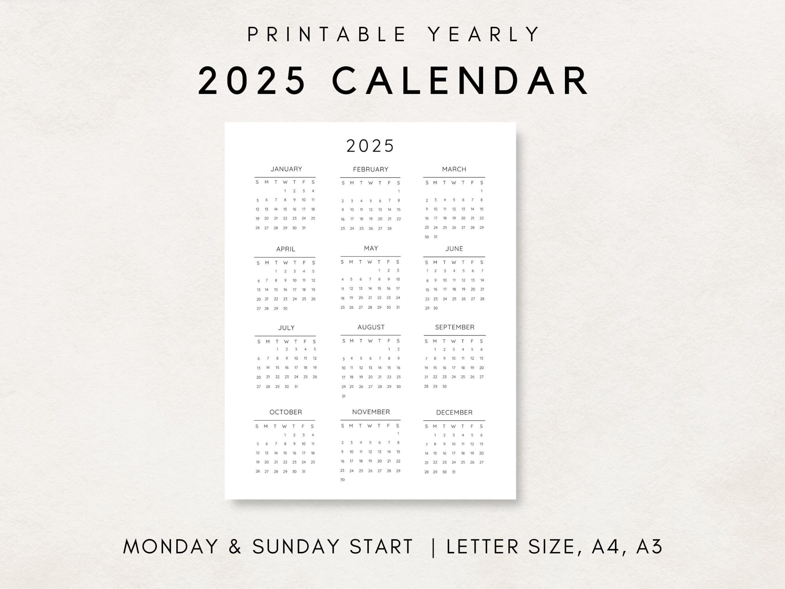 2025 Yearly Calendar Printable Calendar 2025 Calendar 2025 Digital Calendar Yearly Wall Calendar Year At A Glance 2025 Annual Calendar Etsy