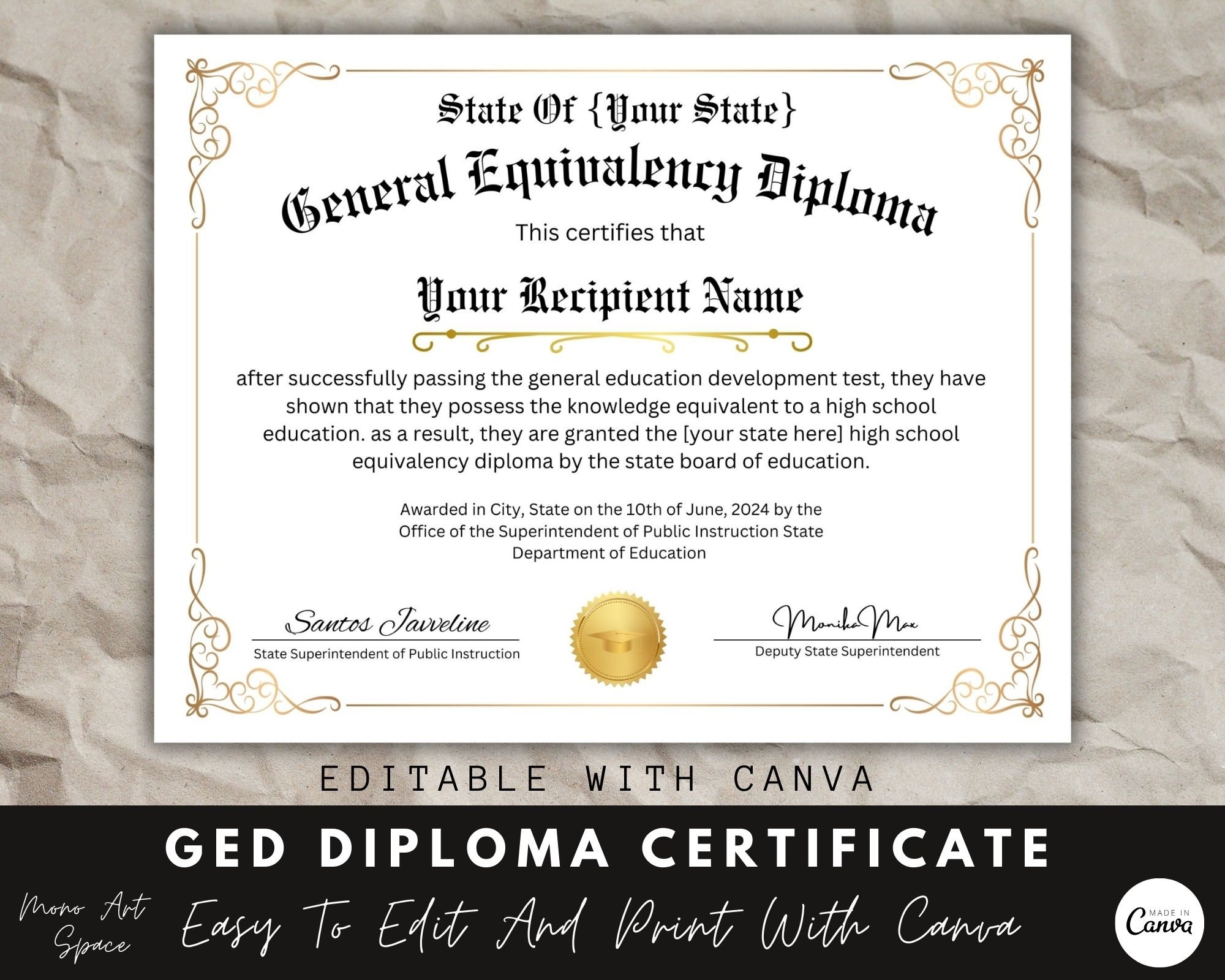 GED Diploma With Gold Seal Editable Certificate Canva Template Diploma Certificate School Equivalency Diploma Instant Download Etsy