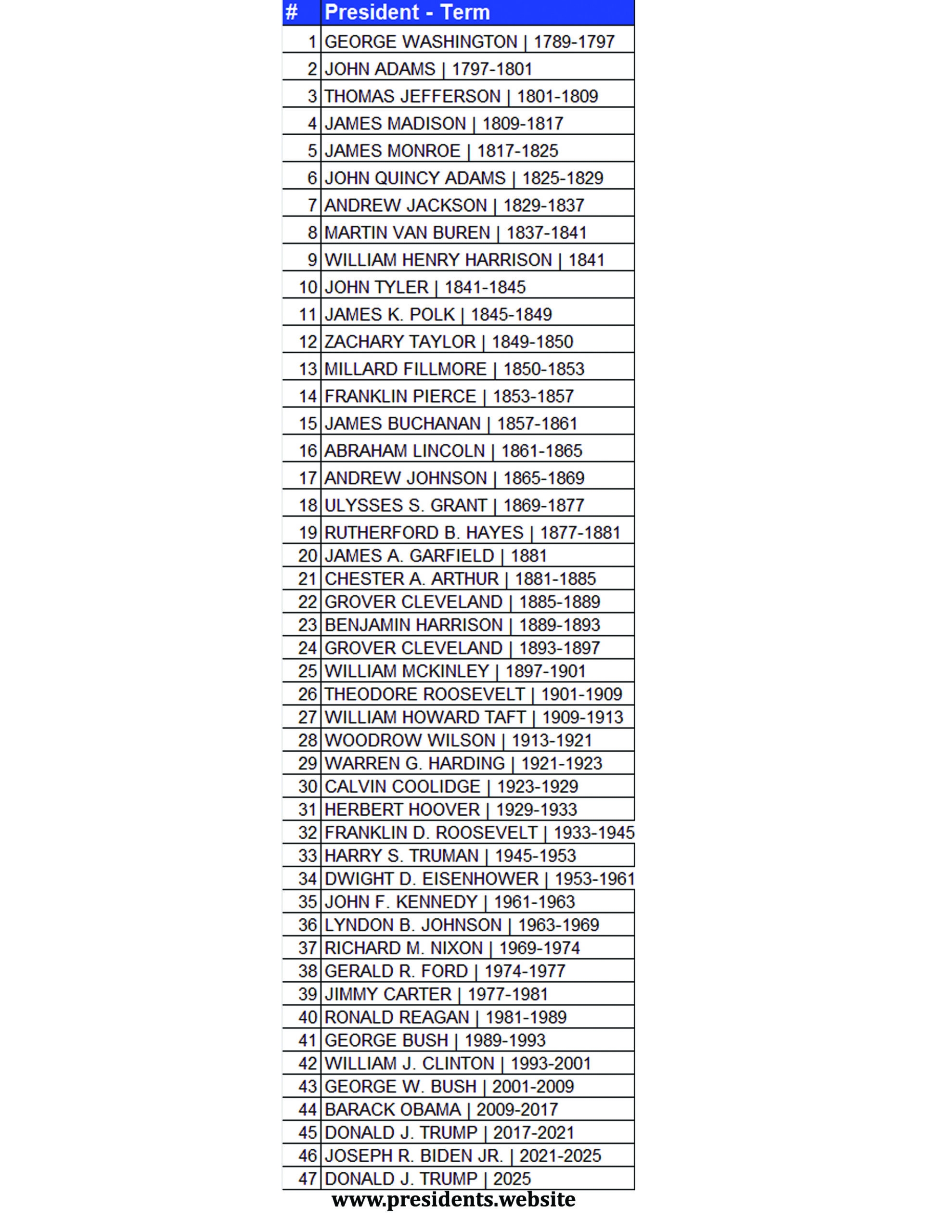 Printable List Of US Presidents Presidents Website